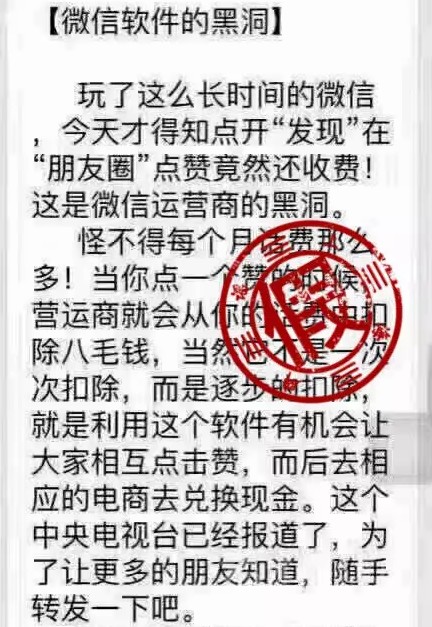 事實(shí)上,這是一條傳播已久的老謠言。此前,“@騰訊用戶服務(wù)”官方微博回應(yīng)稱傳聞純屬謠言:“朋友圈點(diǎn)贊要扣話費(fèi)。怎么可能!免費(fèi)好不好!朋友圈要的就是小伙伴們的情感互動(dòng),情誼無價(jià)!”中國聯(lián)通的工作人員也介紹,運(yùn)營商的每一項(xiàng)常規(guī)收費(fèi),都會(huì)按照雙向通知的原則,即提示客戶所使用的某項(xiàng)業(yè)務(wù)會(huì)收費(fèi),待客戶確認(rèn)了解并同意后才能收費(fèi),所以微信點(diǎn)贊會(huì)被扣話費(fèi)是謠言。記者了解到,“點(diǎn)贊扣話費(fèi)“屬于“微信X月X日即將收費(fèi)”這類謠言的衍生版本。比如,近期網(wǎng)上也出現(xiàn)了“騰訊宣布8月1號(hào)微信所有功能將全部收費(fèi)”的信息。昨天,微信團(tuán)隊(duì)發(fā)表聲明也對(duì)此進(jìn)行了辟謠,稱該說法嚴(yán)重失實(shí)