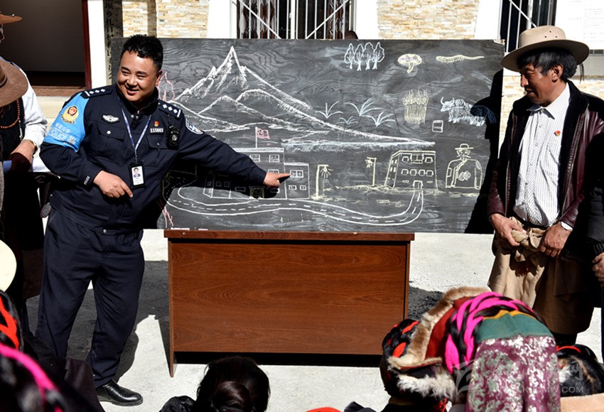 由于轄區(qū)藏族群眾大多都不識漢字、不會漢語,巴桑呷瓦便將自己的繪畫技藝運用到普法教育中,2018年10月,康定市公安局在對聯(lián)系鄉(xiāng)甲根壩開展精準(zhǔn)扶貧工作時,在全市范圍內(nèi)抽調(diào)了巴桑呷瓦等10名富有群眾工作經(jīng)驗的民警,他一邊負(fù)責(zé)沙德鎮(zhèn)派出所日常工作,一邊負(fù)責(zé)兼職扎日村精準(zhǔn)扶貧工作,用繪畫的方式為牧民群眾描繪脫貧致富夢。他把國家的相關(guān)法律法規(guī)、民族政策和惠民工程政策吃透并制作成故事性強、通俗易通的簡筆畫冊向老百姓解讀、宣講。在巴桑呷瓦妙趣橫生、詼諧幽默的“授課”下,深奧的法律政策變得淺顯易懂?!八漠嬓蜗笊鷦?,接地氣,有我們的生產(chǎn)生活場景,我們喜歡看,他的講解幽默風(fēng)趣,我們聽得懂,只要他一下來,村民都圍在他的身邊,舍不得離開?!痹沾宓拇迕褚呀?jīng)把這位“畫家”警察當(dāng)作了自家人。