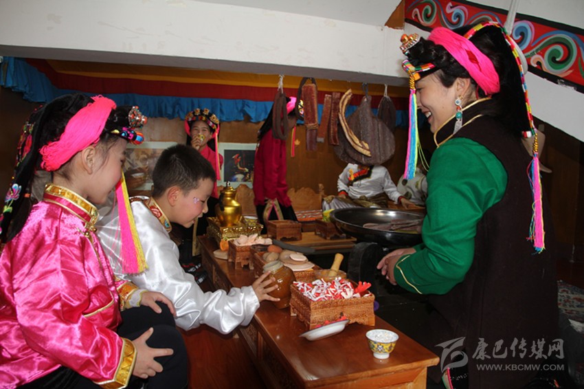 筆者正在參觀時,老師帶領(lǐng)著一群可愛的孩童走進鍋莊房內(nèi)。孩子們脫下鞋襪,盤膝坐在藏床上,一邊做著喝酥油茶的樣子,一邊唱起古老的嘉絨歌謠。稚嫩的嗓音中,遠古文化煥發(fā)出新時期的獨特魅力。老師則坐在火籠邊,不斷地“忙碌”著。孩子們“吃飽喝足”后,走到房屋主人的扮演者老師面前鞠躬致謝,文明禮儀也得到了升華。