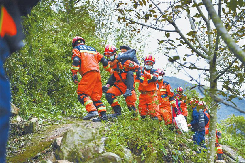 救援隊員協(xié)助紫雅場村最后一批村民下山,他們隨后將通過水路轉(zhuǎn)移至設(shè)在得妥鎮(zhèn)場鎮(zhèn)的受災(zāi)群眾安置點。 四川日報全媒體記者 楊樹 攝