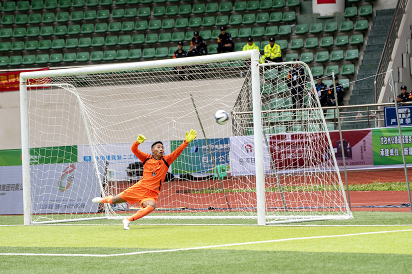 隨著主裁判吹哨發(fā)令,身穿白色球衣的甘南隊(duì)及藍(lán)色球衣的昌都隊(duì)球員各赴站位,迅速進(jìn)入狀態(tài)。上半場(chǎng),甘南隊(duì)積極拼搶、快速進(jìn)攻、精準(zhǔn)傳球,很快主導(dǎo)場(chǎng)上局勢(shì)。而昌都隊(duì)雖后防穩(wěn)健,進(jìn)攻則顯得略為保守。第9分鐘,甘南隊(duì)員在大禁區(qū)前沿帶球晃過(guò)昌都隊(duì)員后,雙方爭(zhēng)奪激烈,甘南隊(duì)員倒地,裁判鳴哨,甘南隊(duì)獲得前場(chǎng)任意球機(jī)會(huì)。在此前比賽中已打入2球的33號(hào)球員索南道吉站上罰球點(diǎn),短暫調(diào)整后打出一記弧線(xiàn)球,昌都隊(duì)門(mén)將撲救不及,足球應(yīng)聲入網(wǎng),甘南隊(duì)取得1:0領(lǐng)先。