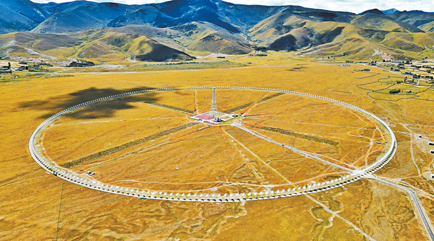 飛機(jī)從稻城亞丁機(jī)場(chǎng)起飛,右側(cè)舷窗外的地面隱現(xiàn)一個(gè)小圓點(diǎn),因?yàn)樵煨吞厥猓?dāng)?shù)厝朔Q(chēng)“千眼天珠”。小圓點(diǎn)其實(shí)一點(diǎn)也不“小”——在海拔3820米的甘孜州稻城縣噶通鎮(zhèn),313部直徑6米的天線,均勻地分布在直徑1公里的圓環(huán)上。它的正式名字叫圓環(huán)陣太陽(yáng)射電成像望遠(yuǎn)鏡(下稱(chēng)“圓環(huán)陣”),是國(guó)家重大科技基礎(chǔ)設(shè)施空間環(huán)境地基綜合監(jiān)測(cè)網(wǎng)(子午工程二期)的標(biāo)志性設(shè)備之一,也是目前已建成的全球規(guī)模最大的綜合孔徑射電望遠(yuǎn)鏡。其任務(wù)主要是對(duì)太陽(yáng)和日地空間傳播鏈條進(jìn)行高質(zhì)量監(jiān)測(cè),監(jiān)測(cè)太陽(yáng)“打噴嚏”。