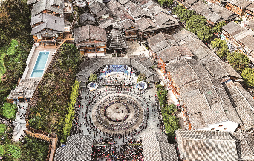 在貴州省黎平縣肇興侗寨,侗族群眾身著節(jié)日盛裝參加侗年踩歌堂活動(dòng)。