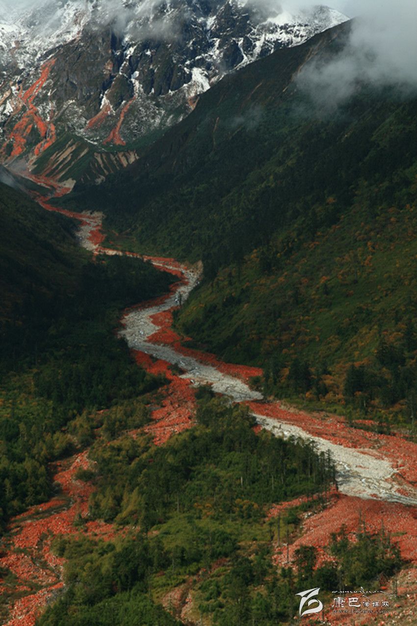 總起來說,紅石灘是這樣一壁畫屏:兩黛山之間,為一大溝;大溝飛流直下,紅石如瀑增多,至平地,紅石成片,如水瀉地;在兩黛山及大溝的背后,為一壁雪山,冰清玉潔,十分醒目。