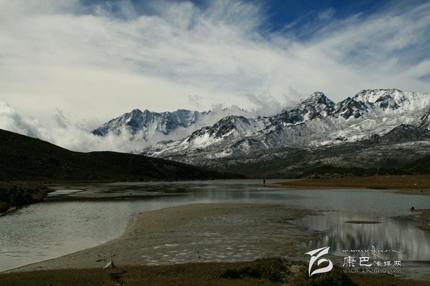 雪山不高,但山脊線波瀾起伏。這樣的雪山倒映在海子中,形成的倒影明晰、對稱、秀麗。