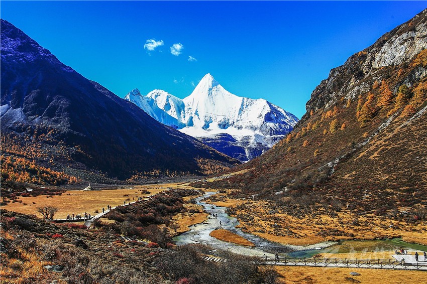 早餐后從稻城出發(fā),翻越海拔4513多米的波瓦山,途徑亞丁村,抵達目的地亞丁景區(qū)。國慶節(jié),亞丁景區(qū)迎來了高峰的人流,排隊等候景區(qū)大巴車的游客,從大廳排列一直蜿蜒到大門口,經(jīng)過2小時漫長的等待,終于抵達景區(qū),徒步步行到?jīng)_古寺,景區(qū)里已經(jīng)人滿為患,眼前的亞丁秋色,讓我們忽略了身邊擁擠的人群,只顧欣賞由草地、森林、小溪和嘛呢堆組成的天然沖古草坪。沿著沖古寺仰望仙乃日神山而上,往返約3公里步行約2小時,一步一步來到美如仙境般的珍珠海;返回山下,繼續(xù)乘坐景區(qū)電瓶車到達洛絨牛場,返程順溪流而下。當天入住香格里拉鎮(zhèn)日松貢布酒店。
