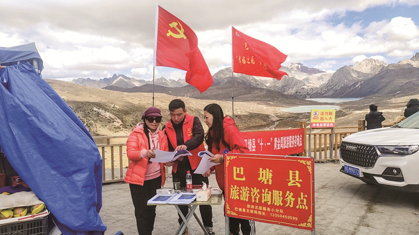 圖為在國(guó)道318線海子山觀景臺(tái)巴塘縣志愿者為旅客提供服務(wù)保障。