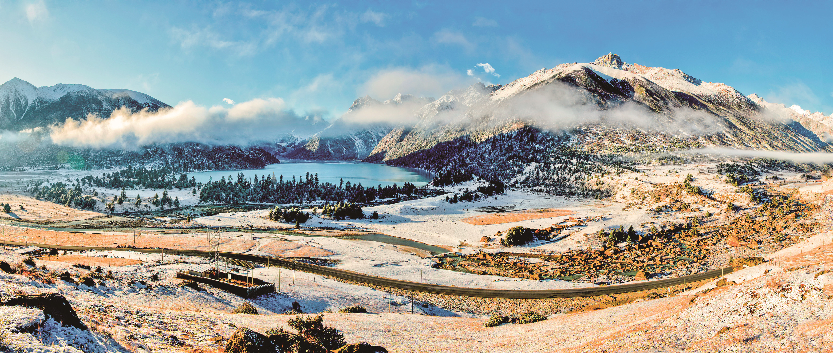 雪山、藍(lán)天白云和黨嶺村的彩林構(gòu)成一幅優(yōu)美的畫卷。新華社 發(fā)