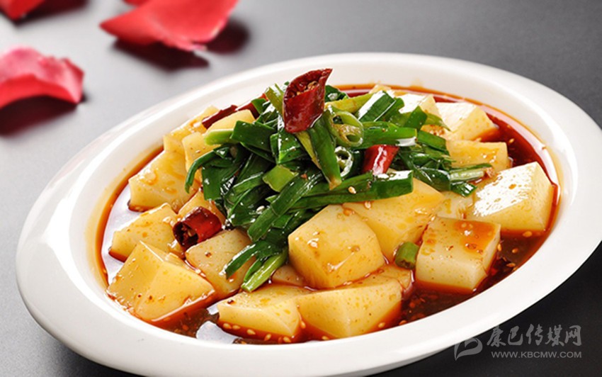 3、攪團:將清水在鍋內(nèi)燒開后,逐量撒入極細的玉米面粉,以當年新產(chǎn)的小金黃玉米粉為佳,用竹筷攪拌,此時灶中火要猛,直到攪成糊狀,然后蒙蓋一層新鮮潔凈的芭蕉葉或青菜葉,再蓋上鍋蓋文火蒸20—30分鐘,用大碗盛起;鍋內(nèi)打油湯,燒煮酸油菜湯,其油鹽調(diào)料如一般湯羹(酸油菜即以野生油菜莖葉,洗凈,在開水鍋內(nèi)略煮一下,即撈起置于木盆或瓷盆內(nèi),趁熱壓緊覆蓋閉氣,隔夜后即成一種酸味菜,可炒食,亦可煮湯食,其味略酸而鮮美爽口,并有一種特殊香味,本地人歷來皆愛食之。