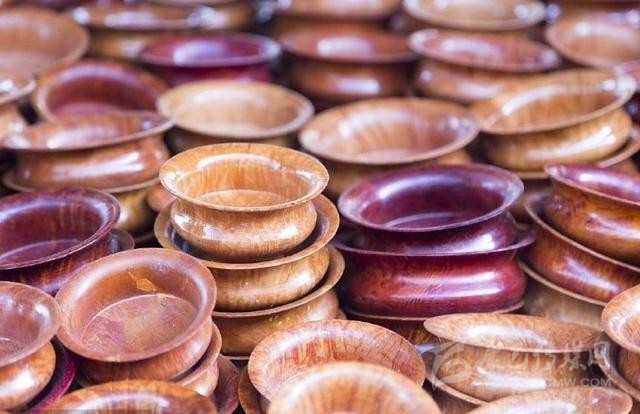 按藏族傳統(tǒng),一般人使用得最多的餐具是木碗。木碗一般用樺木、雜木雕琢而成,質(zhì)地結(jié)實(shí),不易破裂,花紋細(xì)膩,較為美觀。木碗的制作過程,一是選材,二是風(fēng)干,三是制坯,四是細(xì)磨,五是上色。藏族木碗可分為大碗、小碗、蓋碗、套碗、木缽等多種,用途廣泛,可供喝茶,吃糌粑,存放食品、香料、佐料等,而且還具有光滑、細(xì)致、美觀、適用、不變味、喝茶香、攜帶方便等特點(diǎn)。雜木碗還有防毒的優(yōu)點(diǎn)。至于純金、純銀做成的勺子、筷子、碗和盤,雖然在民間也能見到,但畢竟不是被普遍使用的生活用品,一般給客人奉茶都使用瓷碗。