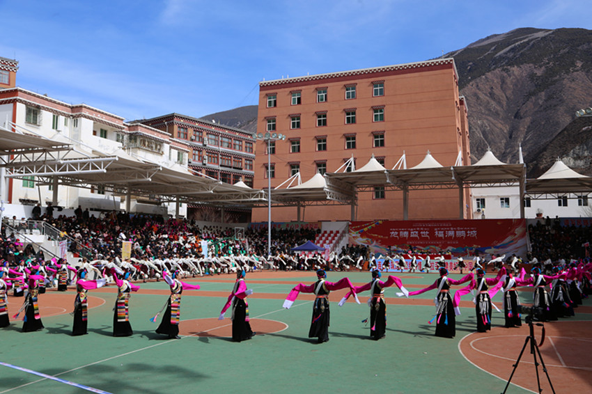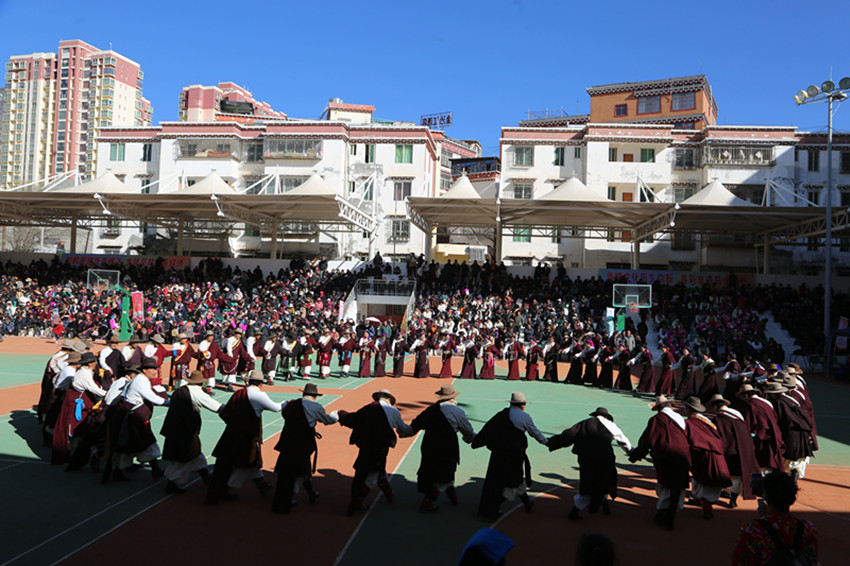 弦音聲動鬧新年,紅綾長袖舞春風,千人弦子鍋莊,唱出龍年大團圓,踏出幸福新舞步……2月13日,在巴塘縣全民健身活動中心舉行的春節(jié)暨藏歷新年系列活動“文化·點靚生活”——巴塘縣五彩藏鄉(xiāng)藝術周弦子鍋莊展演活動現(xiàn)場喜氣洋洋、人頭攢動,上千名群眾身穿節(jié)日盛裝,拉起弦胡,載歌載舞,共同慶祝新春佳節(jié),祈盼龍年國泰民安、風調(diào)雨順。圖為活動現(xiàn)場。 敖梅 李穎/文 格桑澤仁/圖