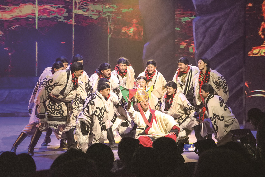 這是一場充滿康巴文化底蘊的視聽盛宴,高品質(zhì)的演出陣容,極具地方特色的舞臺效果,引人入勝的劇情細節(jié)……演出在一首阿卡貝拉版《康定情歌》中拉開序幕,7名演員以多聲部合聲演繹這首蜚聲中外的世紀(jì)情歌,舞臺紗幕上顯現(xiàn)的星光點點,仿佛將璀璨星空搬到了舞臺上。