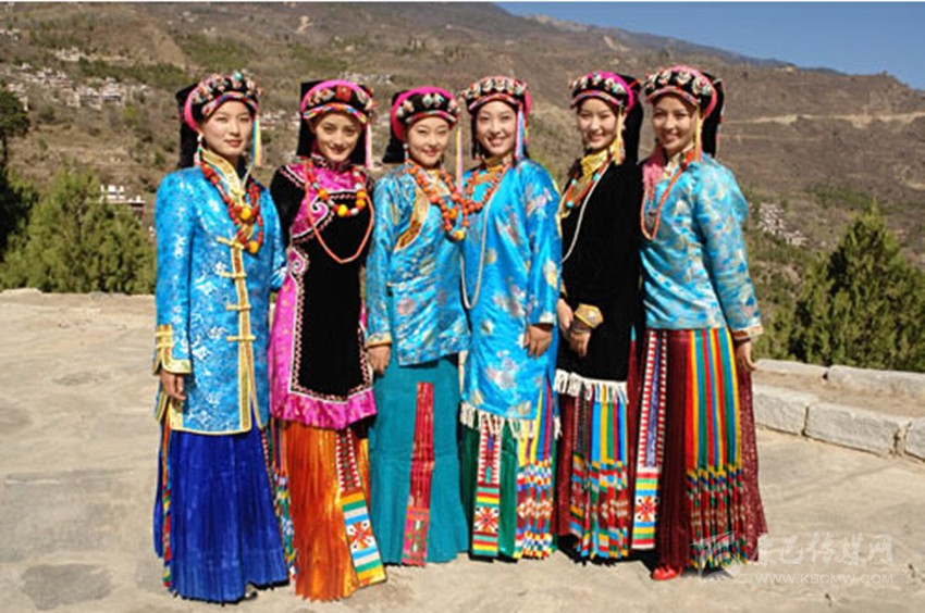以丹巴縣和康定縣大渡河沿岸為代表??刀~通區(qū)和雅拉鄉(xiāng)一帶又自有特點。以長方形黑金絲絨底繡花頭帕對折,戴于頭上,額前伸出約數(shù)厘米,腦后下披至后頸,寬至兩鬢,然后用大紅頭繩或五彩頭繩瓣發(fā)盤于帕上,辮子套各式辮飾。外披披風(fēng),一般是條紋白色或原初皮毛披風(fēng),內(nèi)穿錦緞上衣,下著五彩百褶長裙,腰系絲織或綢質(zhì)彩色花腰帶,男戴金絲帽,足穿彩靴為風(fēng)彩。嘉絨地區(qū)服飾還受羌族習(xí)俗的影響,生活俗裝普遍穿長等衫,以藍黑色為主,下身系圍腰,腰扎寬大彩帶,冬天穿羊皮褂或羊毛織成的無領(lǐng)服等。