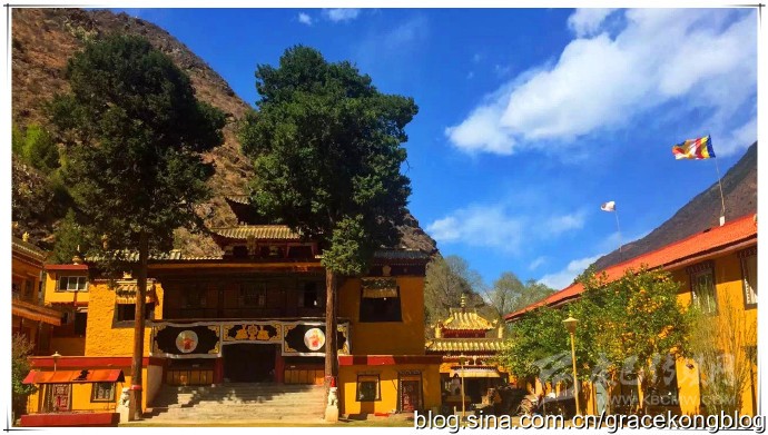 該寺廟為四合院布局,坐北朝南,原占地面積2700㎡,為藏漢結合建筑,由大殿、藏經(jīng)樓、僧舍組成。大殿為藏式石木結構,有二十四根雕龍木柱,殿分二層,供有釋迦牟尼、宗喀巴、未來佛、千手觀音、南海觀音等神像,殿側藏經(jīng)樓藏經(jīng)書上千卷。殿堂富麗堂皇,壁畫五彩斑斕,閣樓古樸美觀,雕梁畫棟,分外精巧;廟四周古柏參天蔽日,綠草如茵,風景格外迷人。