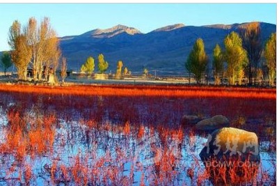 距稻城縣城金珠鎮(zhèn)28公里的桑堆小鎮(zhèn)風(fēng)景綺麗,在公路沿線的牧場開闊平展,河流平緩如鏡。遙望遠處,在起伏的山巒間散落著村落、牧人、牛羊,呈現(xiàn)一派寧靜祥和的景象。公元1144年前,一世噶瑪巴·都松欽巴覺悟贊譽:“我走遍藏區(qū),來到此地。這里風(fēng)景秀美,牧草豐茂,六畜興旺,佛光普照。我愿在此修建寺廟成就功德”。金秋十月的桑堆紅草灘總是讓你感覺膠卷不夠用。